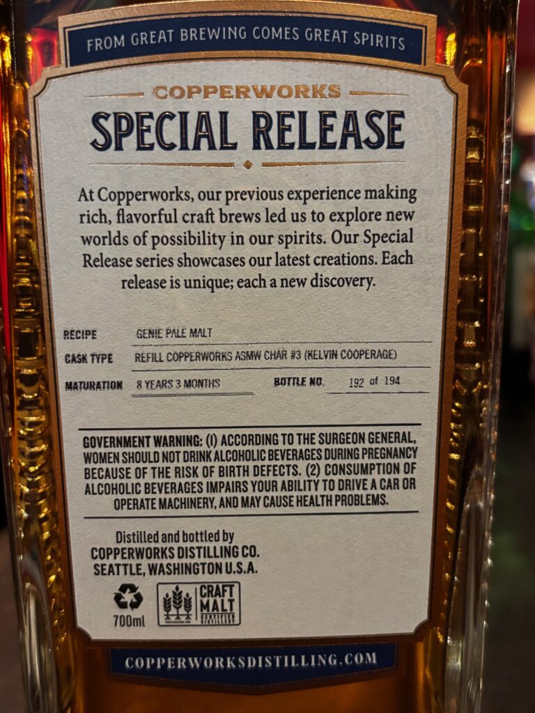 裏ラベルをご覧いただくと「REFILL COPPERWORKS ASMW CHAR #3」と書かれていますが、ASMWはアメリカンシングルモルトウイスキーを意味し、カッパーワークスでアメリカンシングルモルトウイスキーを作った後にチャーされたカスク番号3にリフィルしたことがわかります。