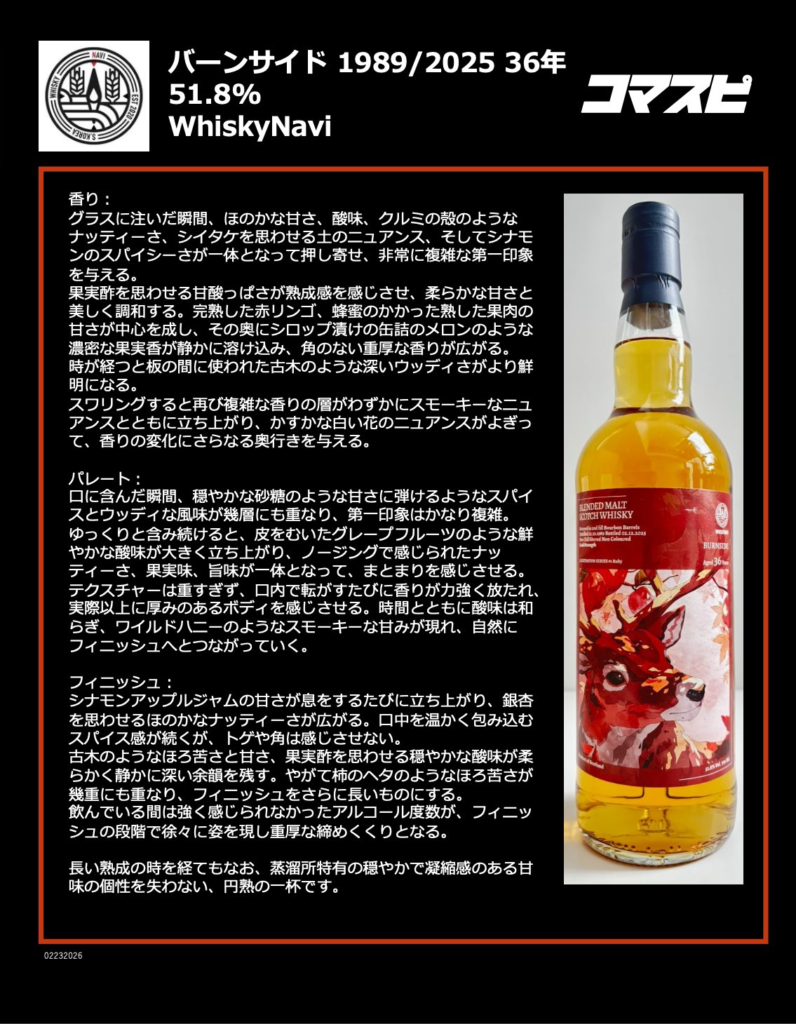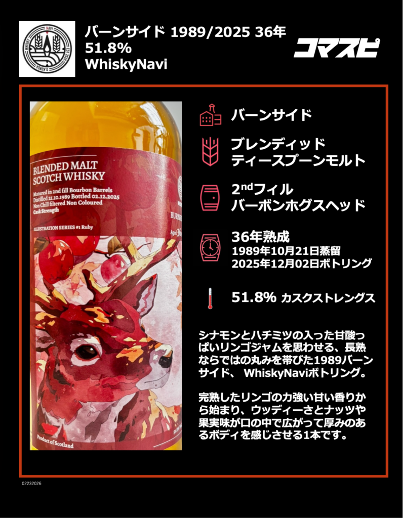 では早速ですが(絶違)、本日2月28日12時30分発売、今最も勢いのあるボトラーの一つWhiskyNaviからリリースされるバーンサイド 1989/2025 36年 2ndフィルバーボンホグスヘッド 51.8% 700mlのご案内です。