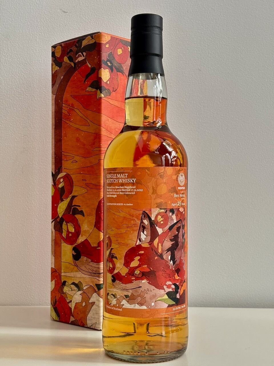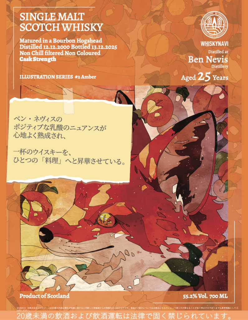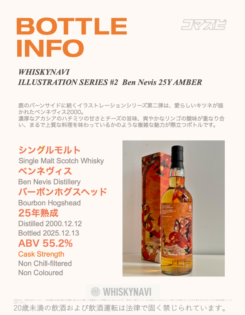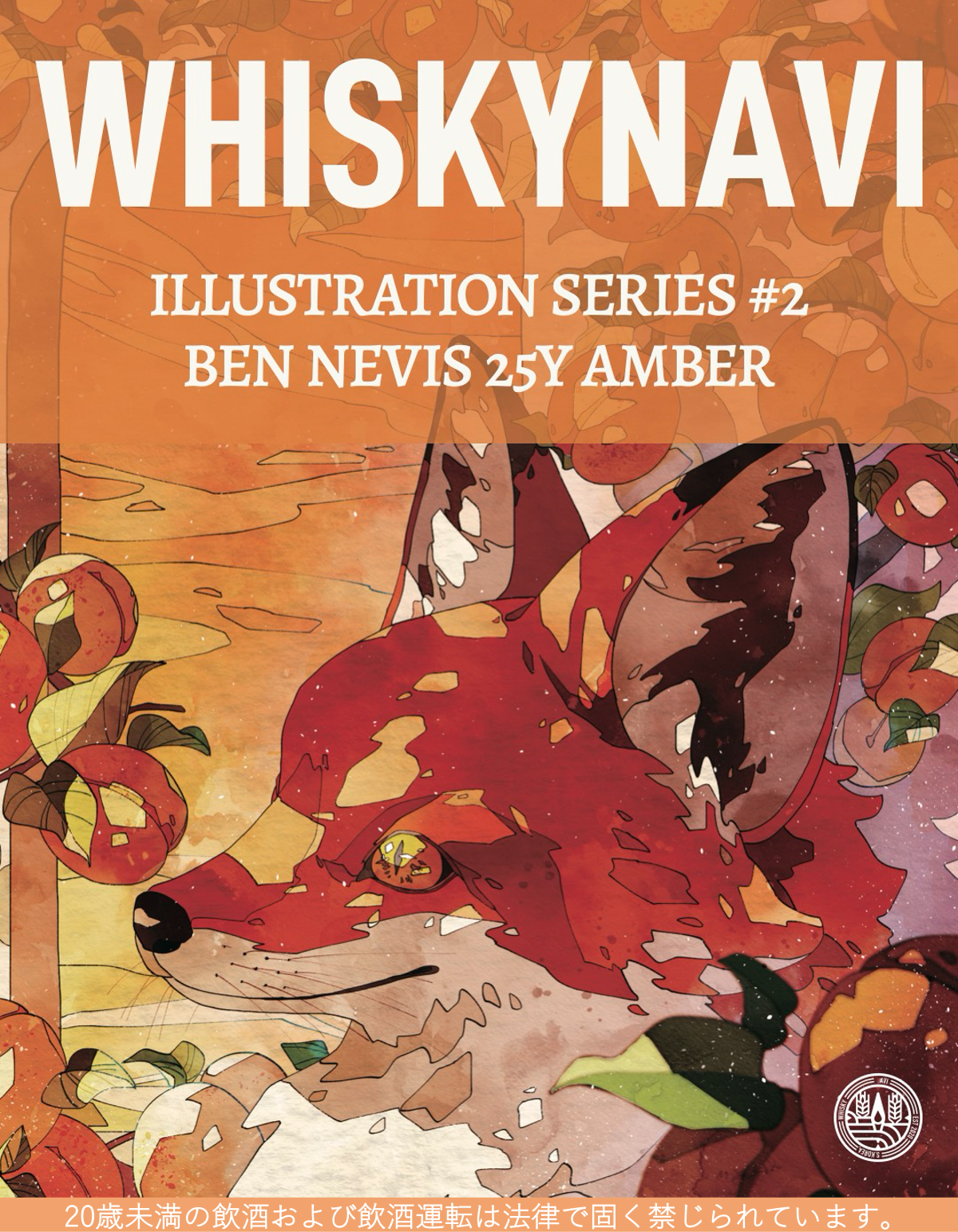 先日のシカが描かれたバーンサイドに続く、WhiskyNAVIからのイラストレーションシリーズ第二弾、キツネのイラストが愛らしいみんな大好きベンネヴィスの2000年蒸留の王道バーボンホグスヘッド25年熟成です。